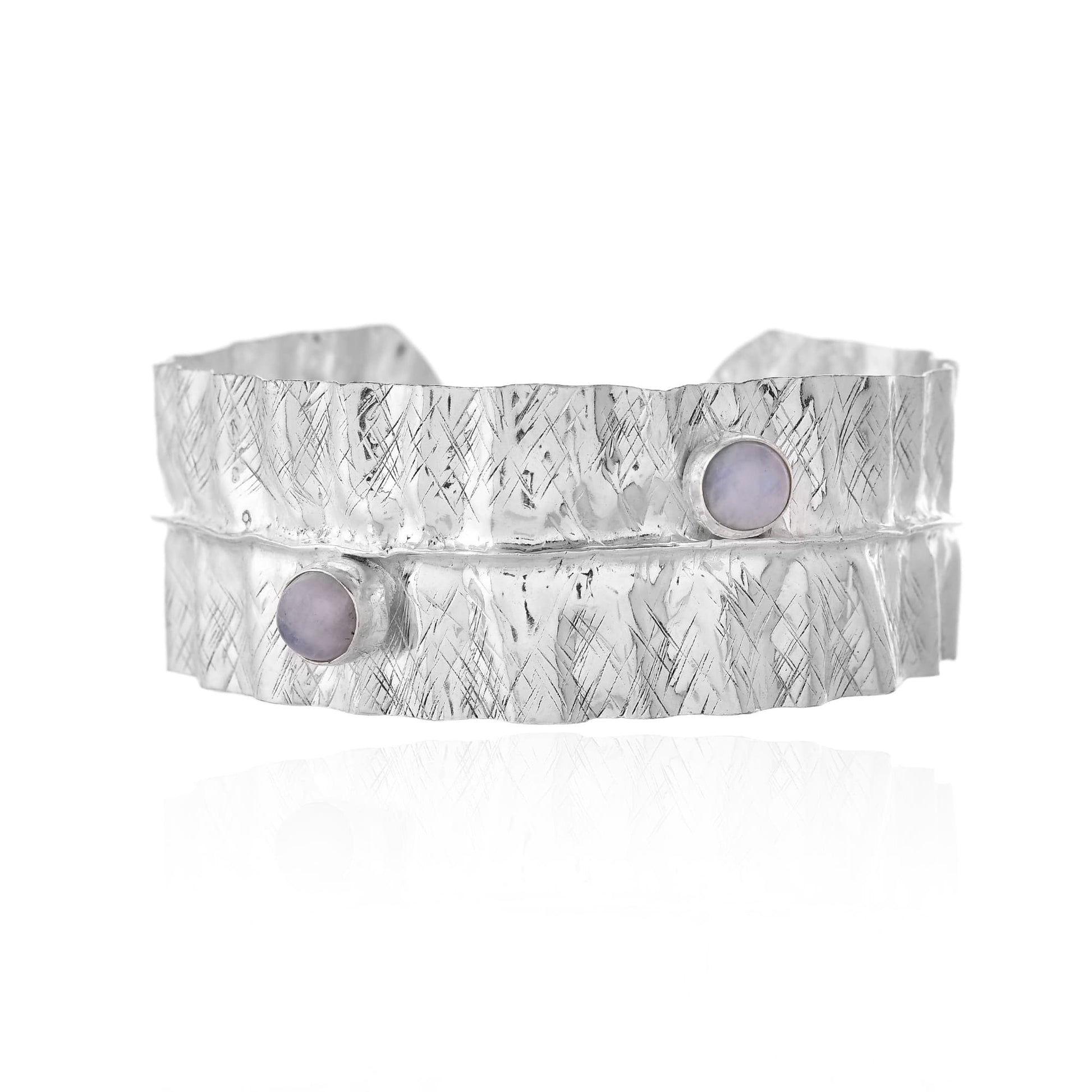 92.5 Sterling Silver Textured Bangle with White Rainbow Stone – Handcrafted Luxury Jewellery