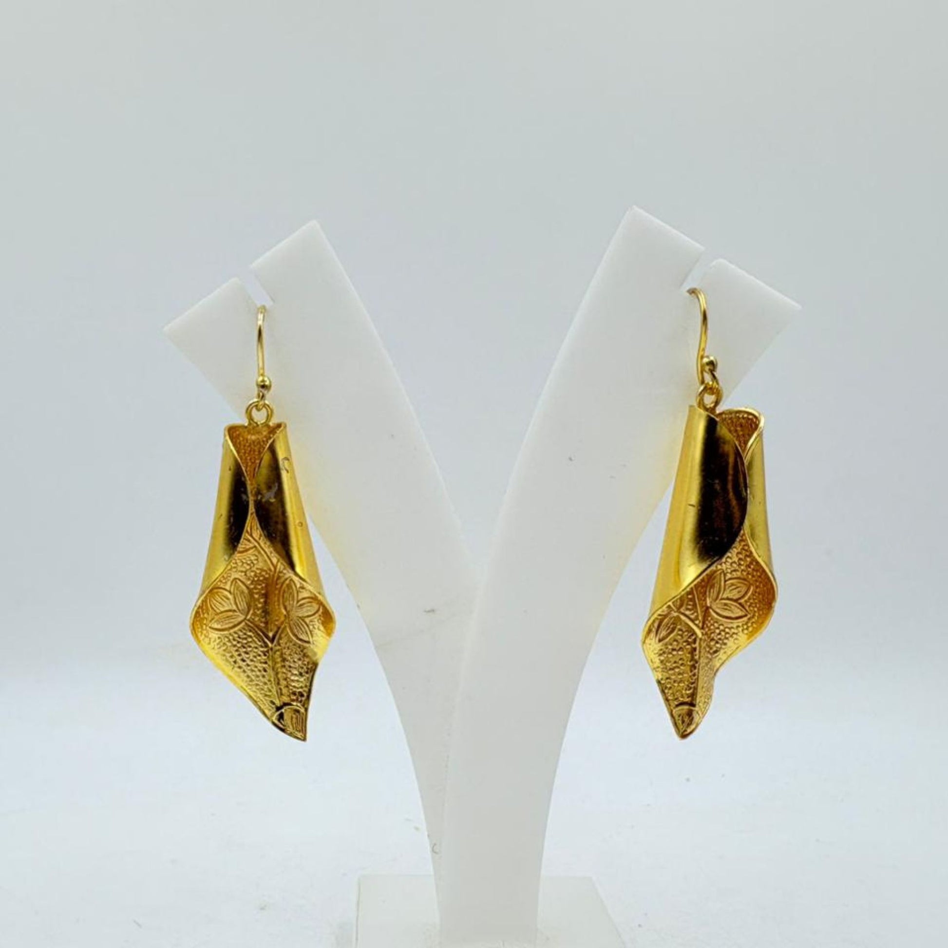 The brass abstract dangle earrings with 18K gold plating – modern artistic design (model no. 14) are made from premium quality brass, featuring a smooth gold-plated finish with artistic folded detailing that gives a sculptural look. At 9.0 g, these brass abstract dangle earrings with 18K gold plating – modern artistic design (model no. 14) are lightweight and comfortable for long wear.