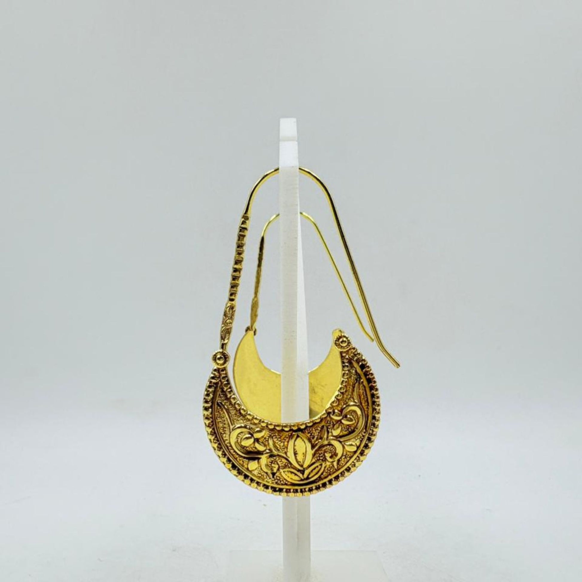 Perfect for festive occasions, weddings, and everyday style, these brass crescent hoop earrings with 18K gold plating – intricate floral design (model no. 11) bring an ethnic yet modern touch. The timeless crescent silhouette makes these brass crescent hoop earrings with 18K gold plating – intricate floral design (model no. 11) a versatile accessory.