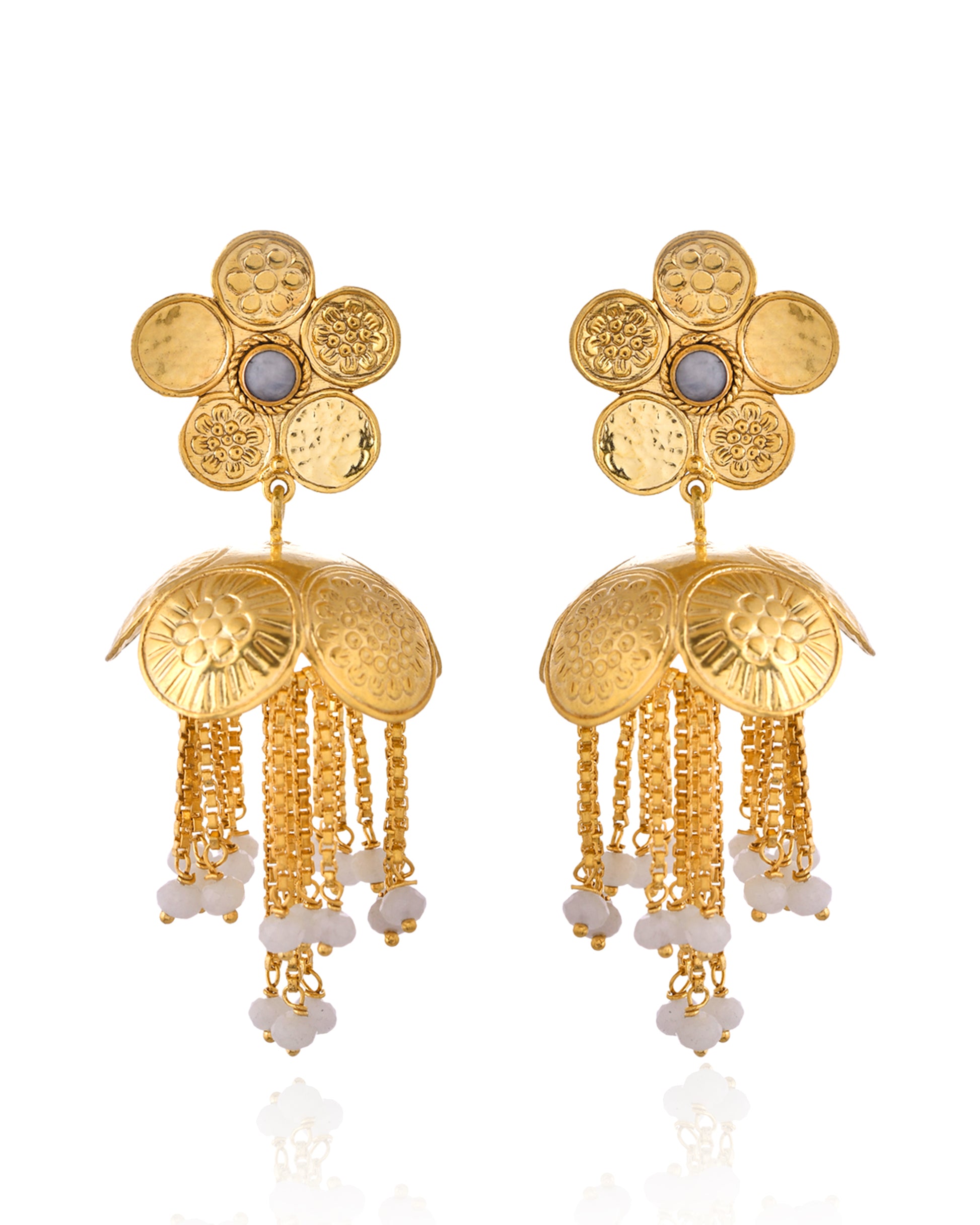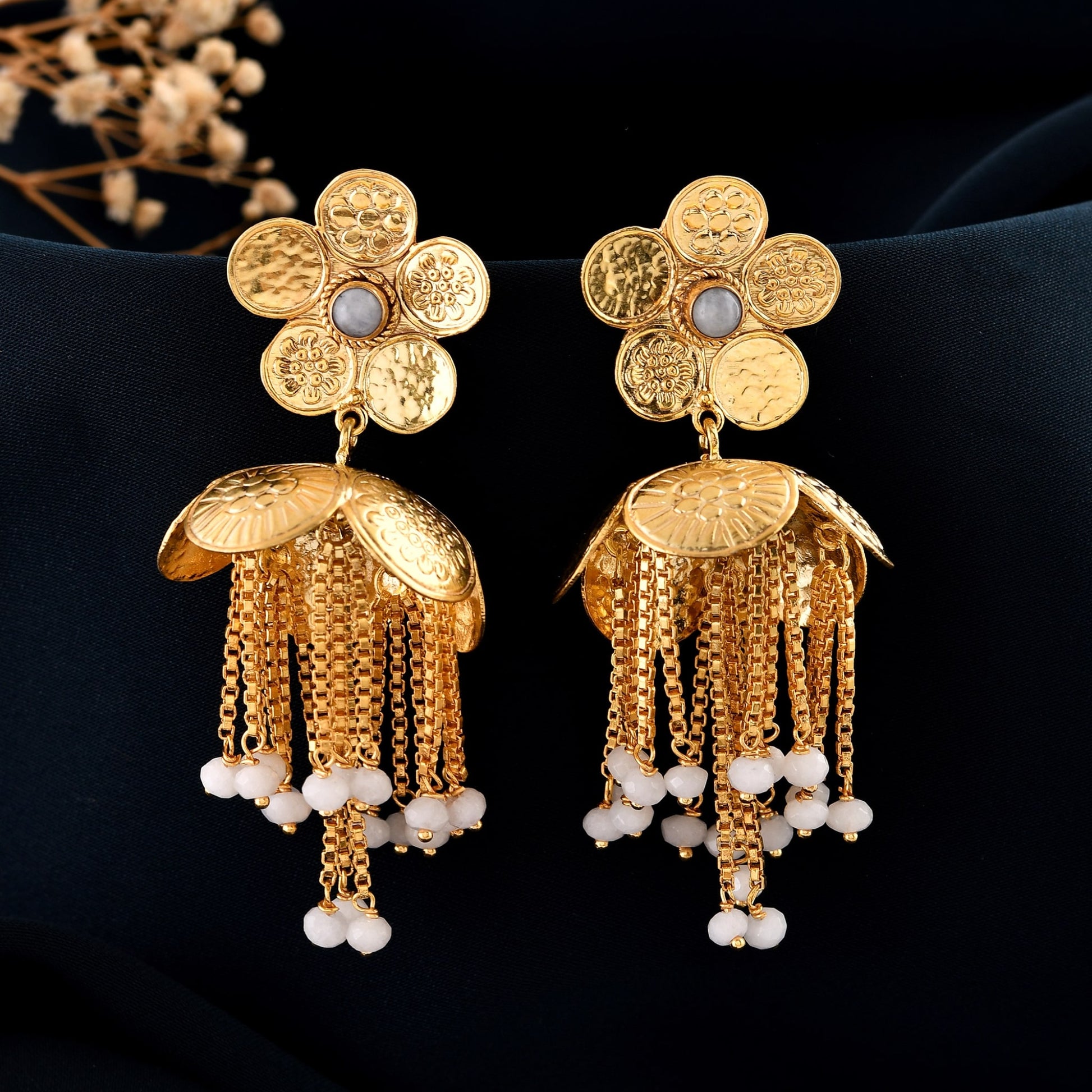 Gold Plated Brass Earrings with Floral Top & Jhumka Danglers – Designer Ethnic Statement Jewelry