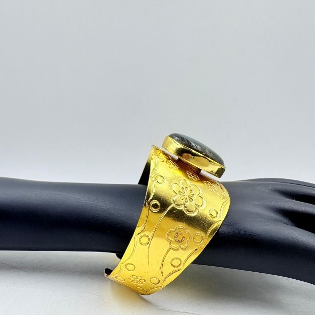 This brass bangle with black rainbow is a beautifully handcrafted piece designed with premium brass and finished with 18K gold plating. The brass bangle with black rainbow showcases a bold central stone that shines with subtle rainbow hues, making it a perfect statement accessory.