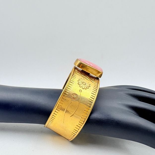 Golden Floral Brass Cuff with Pink Onyx Gemstone