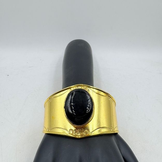 This handmade brass bangle with black onyx stone is a masterpiece of craftsmanship. The black onyx stone is carefully set in a wide brass band with 18-carat gold plating, giving it an elegant and luxurious look. The black onyx stone makes the bangle unique, and the black onyx stone highlights its bold charm.