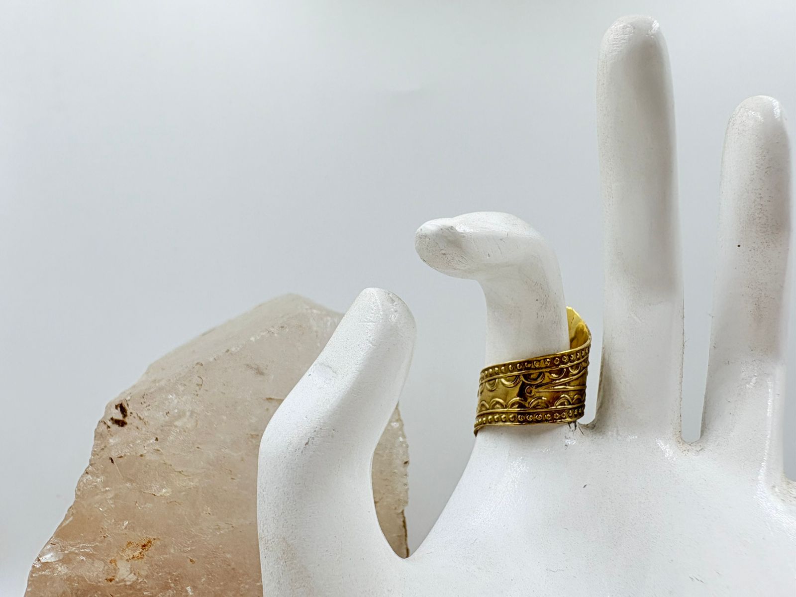 The brass ring is designed in an adjustable open style, making it versatile for different finger sizes. With its green stone detailing, this brass ring complements both traditional and modern outfits. If you’re looking for a lightweight, handmade brass ring, this piece is the perfect choice.